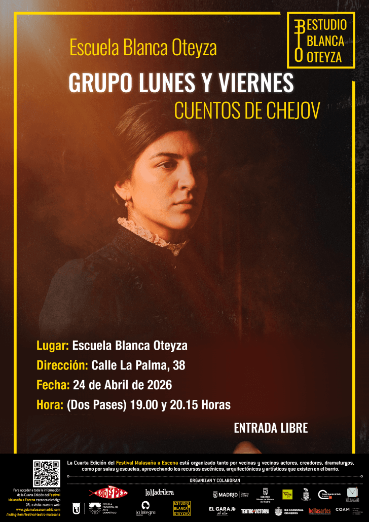 CUENTOS DE CHEJOV, viernes 24 de abril dos pases: 19h y 20:15h en la Escuela Blanca Oteiza (c/ La Palma, 38). Entrada libre